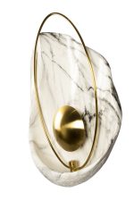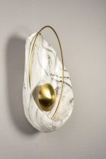 Both visually rich and dramatic, this flush mount wall lamp interchanges points of jeweled light and planes of textured stone.